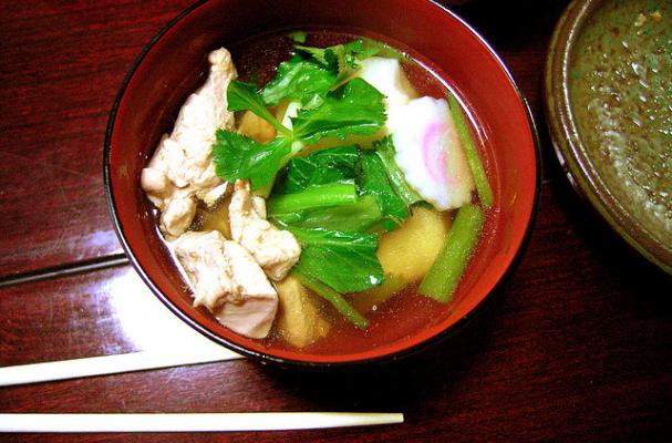 Ozoni is a typical Japanese soup eaten on Oshogatsu, the first day of the New Year. Variations are wide, this one is a Tokyo-style version containing a soy sauce-flavored chicken broth and toasted mochi. Mochi are pounded rice cakes and are available in Asian markets. They are either round or square.