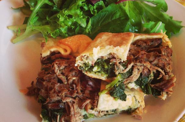 Slow cooked Italian beef, slightly bitter broccoli rabe and sharp provolone all wrapped up in a flaky pie crust! So good!! There is plenty of beef left over after making this, I stirred the extra shredded meat in with a basic tomato sauce for a nice hearty bolognese.
