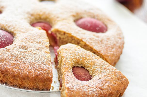 If using a silicone cake pan, place this onto a baking tray and pour the mixture in the pan. If using other type of cake pan, line this with baking paper (if you don’t know how to line cake pans, have a look at our video). Spread the mixture around evenly. Top with plums.