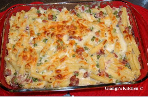 Preheat the oven at 375 º. Cook the pasta al dente in a large pot of salted water. In the meantime prepare the béchamel sauce. Add the mozzarella, the peas and the ham.