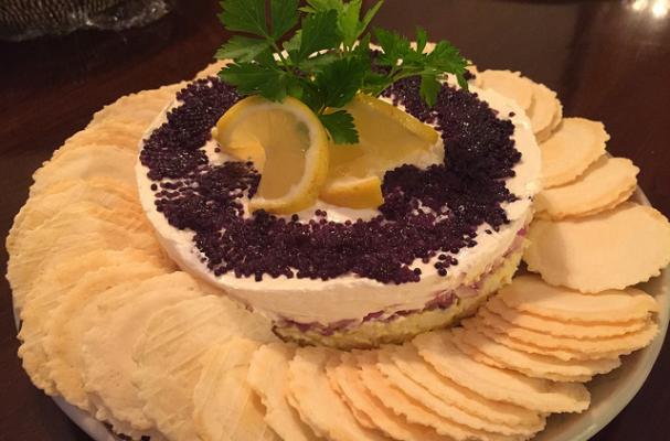 This layered caviar pie is always a crowd-pleaser at parties! Start with a base of chopped hard-boiled eggs mixed with a bit of mayo, top with finely diced onions, followed by a creamy mixture of cream cheese and sour cream smoothed over the top. Refrigerate overnight, then just before serving top with caviar. Easy and delicious!
