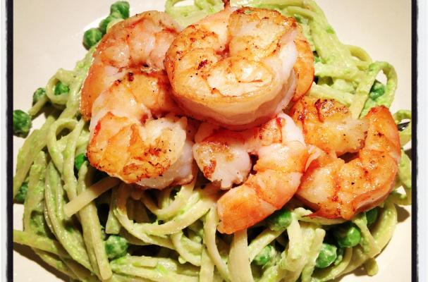 Linguini in a Creamy Pea Sauce and Sautéed Shrimp