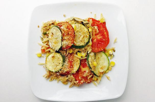 Fresh zucchini and tomato with a crunchy panko layer tops a creamy orzo mixed with chicken, fresh corn, lemon and spices