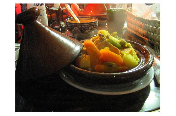A Tajine or Tagine is a unique cooking vessel used to prepare a Moroccan stew made of dried fruits, vegetables and meat. The dish prepared using the Tajine or Tagine is also called the same name.