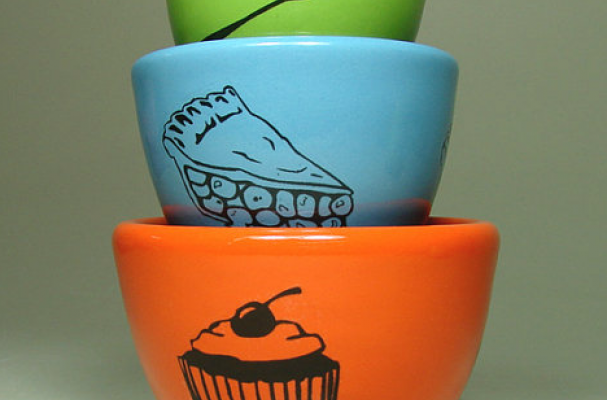 The Just Dessert bowl set from Circa Ceramics is sweet serving ware. These three brightly colored porcelain bowls are perfect for serving your favorite treats. The bold black print features a cupcake, pie, and a fork. The company also makes other foodie inspired ceramics including platters, magnets and mugs. Visit their Etsy shop to browse the entire collection.