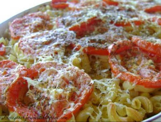 Drizzle a little olive oil at the bottom of a baking dish and place half of the macaroni. Pour the mixture over the macaroni and place half of the tomato slices on top. Place the rest of the macaroni, the rest of the tomatoes and grate Romano cheese over the top, along with a drizzle of olive oil.