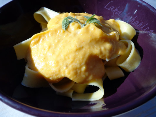 Cook fresh broad noodles according to the instructions, drain and serve immediately topped with the creamy pumpkin sauce.