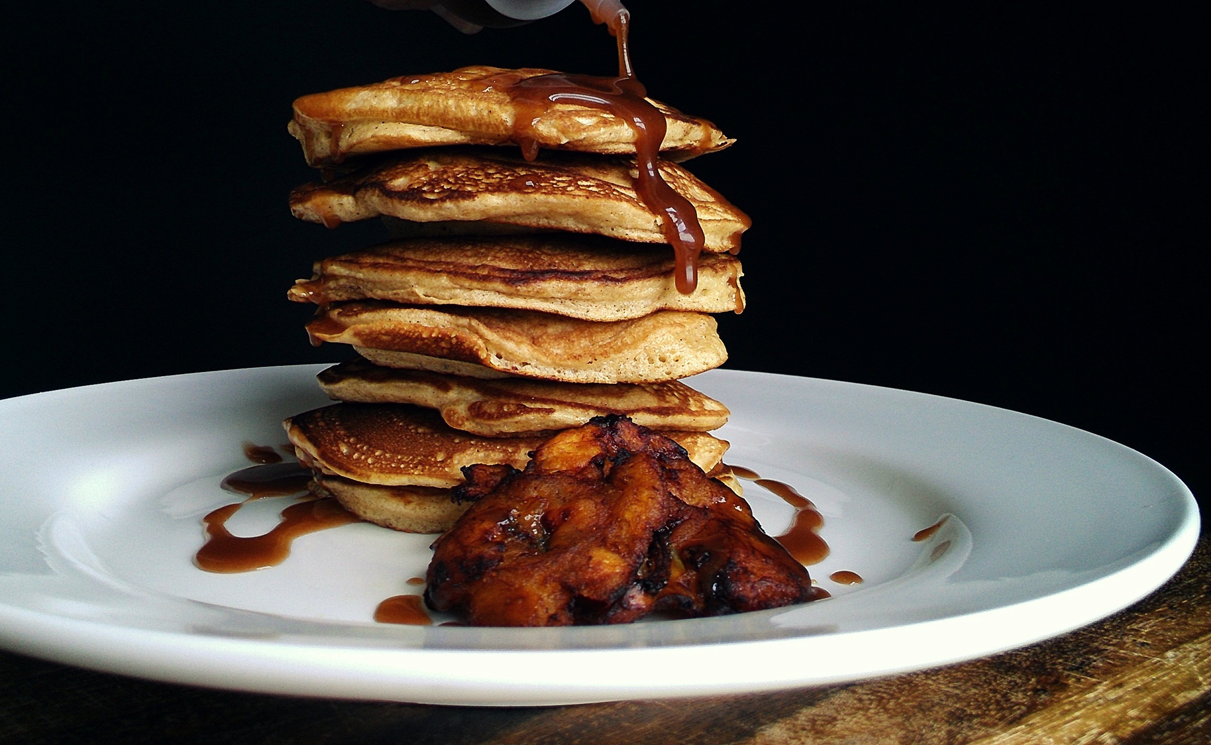 Tostone Stuffed Pancakes with a Chocolate Peanut Butter Syrup