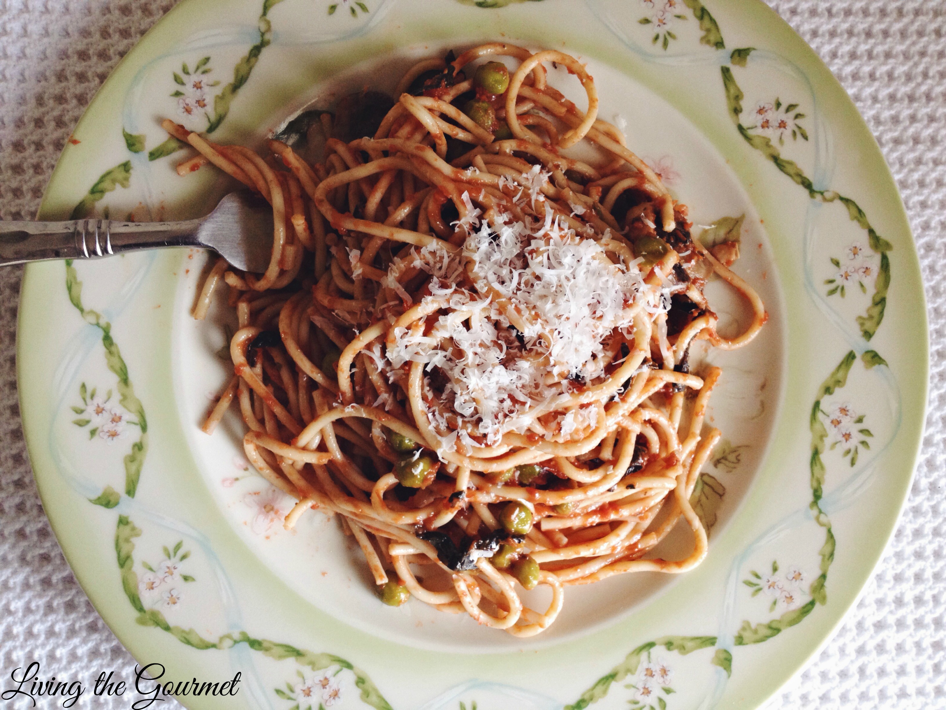 Add the grated cheese and the peas and simmer gently, while preparing the spaghetti as directed.