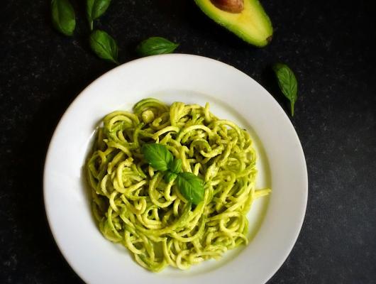 Paleo Zucchini Noodles with a Creamy Avocado Pesto Dressing
