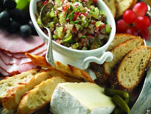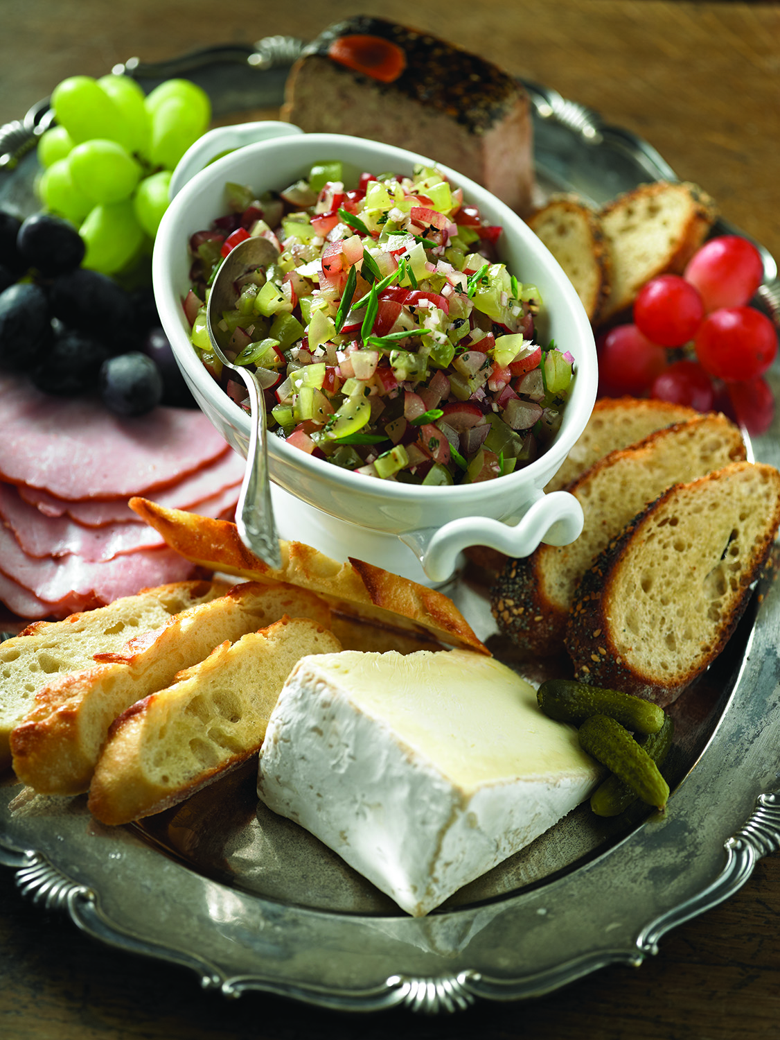 This grape relish is delightful as a colourful topper on crostini, and makes a wonderful accompaniment to meats and cheeses. Plus, it's simple to make and easy to serve. For the ultra-perfect offering, include a bowlful of relish on your buffet platter along with artfully arranged crostini, assorted cheeses, ham, pate, grape clusters and a mix of interesting mustards.