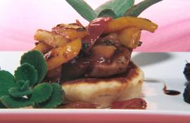 Brandy Plum Pork Tenderloin Served On Buttermilk Corn Cakes