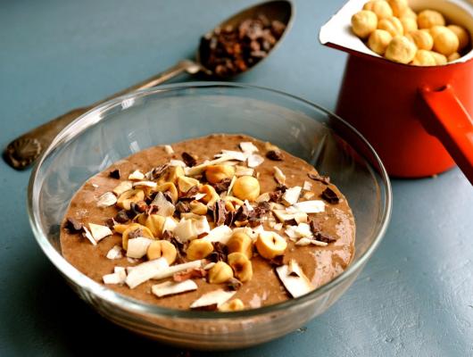 Blend to a fine creamy mousse consistency. Serve in a bowl and garnish with chopped, toasted hazelnuts, coconut flakes and cocoa nib.