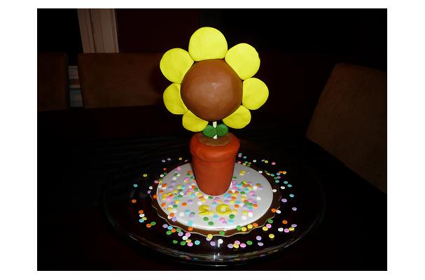 top of second layer of cookies, place silk flower in flower pot and arrange gummy worms around.