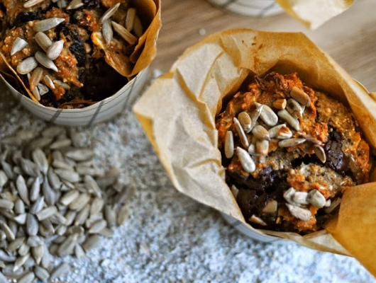 Prepare a large muffin tray lined with parchment paper cut to size. Put batter in paper baking cups using 2 spoons and sprinkle with sunflower seeds or walnuts to taste Hint: if you have an ice cream scoop, this will make it much easier and ensure consistency.