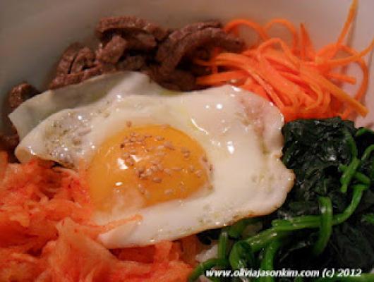 Along with kimchi, bibimbap takes its place among the favored foods in Korean cuisine. Literally meaning "mixed rice," it's a popular and healthy meal consisting of white rice topped with vegetables, beef, a whole egg, and gochujang (red chili pepper paste). For those who cannot handle the spiciness (like our children), you can substitute with soy sauce in place of it. As with variations with different ingredients, there is also its distant cousin dolsot bibimbap, which is bimbimbab served in a heated earthenware bowl. I love these stoneware pots because they always come out sizzling/bubbling/steaming and keep the food super-hot, even after finishing the meal. Ddukbaegi (stoneware for soups & stews) is similar to dolsot and can be seen served in many Korean restaurants. Though we don't own any right now, hopefully we'll be able to purchase one of these rustic, traditional bowls when the colder weather comes around.