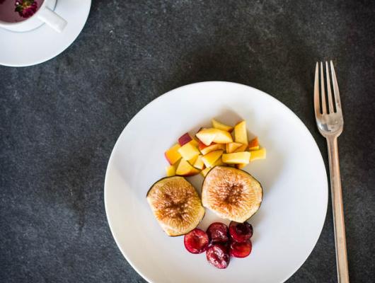 Place 2 fig halves, cherry halves, peach pieces on a plate – 4 servings.