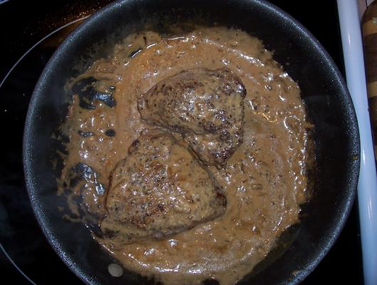 Once the sauce is thicken to this stage reduce the heat slightly and add the ½ & ½ and the sour cream and stir to combine. When the sauce is well mixed place the steaks with any juices that have accumulated back into the pan and coat with the sauce. Plate, spooning sauce over the top of each steak and serve, placing remaining sauce in a sauce boat on the side.
