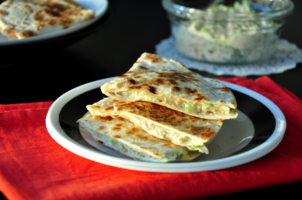 Quickly scoop 2 heaping tablespoons tuna salad filling onto half side of the tortilla. Spread out the tuna salad filling by the back of a big spoon. Place 1/4 cup mozzarella cheese on the other half side of the tortilla.