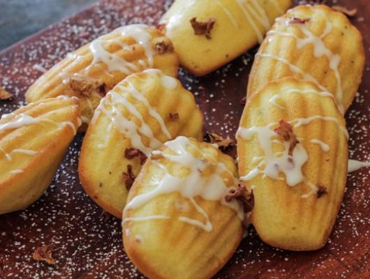 – Mix the sifted icing sugar with a tablespoon of rosewater (add more if needed) to get a thick icing that you can drizzle over the madeleines.