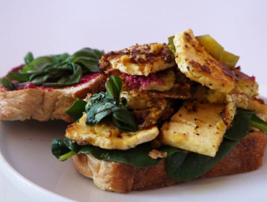 Dress the sandwich as you like it. I like mine with sauteed veggies and spinach, but if you would rather have a tofu club sandwich, use tomato, avocado and lettuce. It's your sandwich and you are the cook after all.