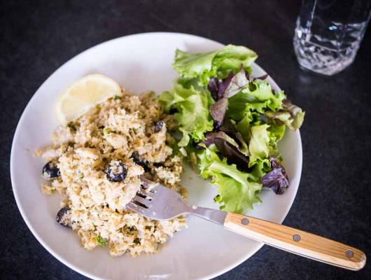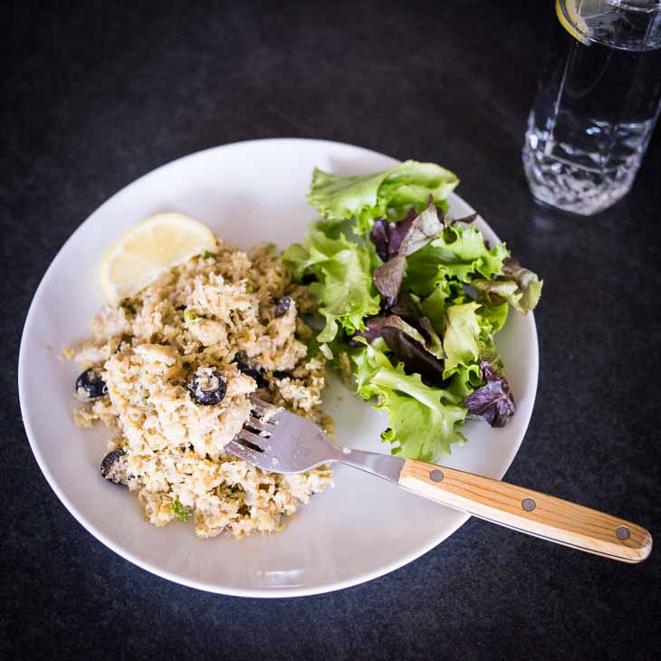 Add in the flaked cod, parsley and olives, and season with salt to taste.