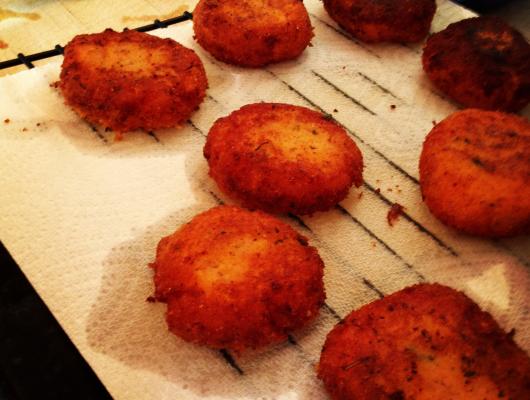 Add in several of the croquettes and gently press down with a spatula to flatten just slightly. Fry until golden brown on both sides. Place onto paper towels to absorb any extra oil.