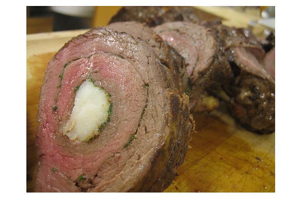 Cut tenderloin lengthwise to within 1/2" of bottom. Simmer frozen lobster tails in boiling salted water 5 minutes. Remove lobster from shells. Cut in half. Place lobster end to end inside beef. Drizzle combined melted butter and lemon juice on lobster. Close meat around and tie together with string. Roast at 425 degrees for 30 minutes on rack in roasting pan. Saute onion in butter in saucepan, add wine and garlic salt and heat.