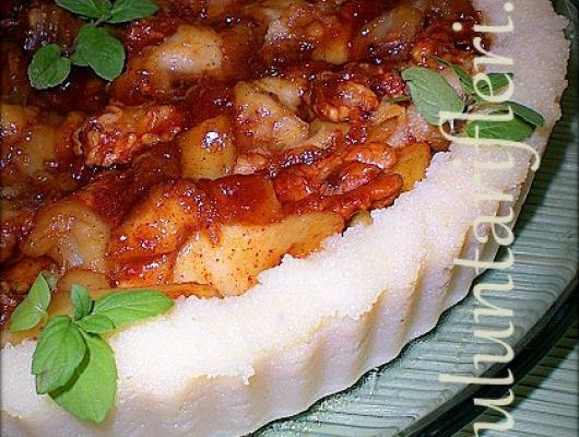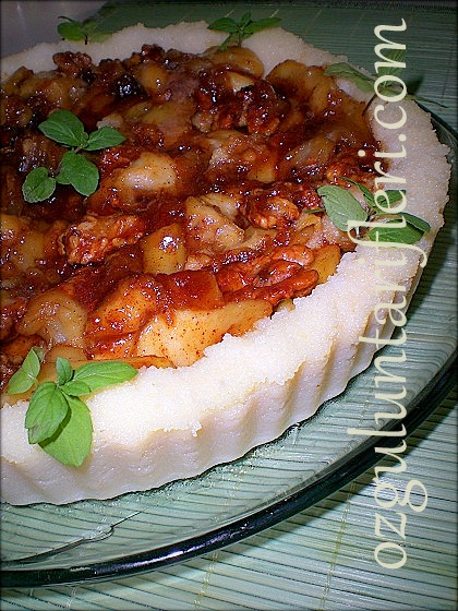 Tart kalibini veya yuvarlak borcam tepsiyi islatip pisirilen karisimi icine dokun. Kasikla yan duvarlari yuksektin.( resimli yapim asamasinda gorundugu gibi )