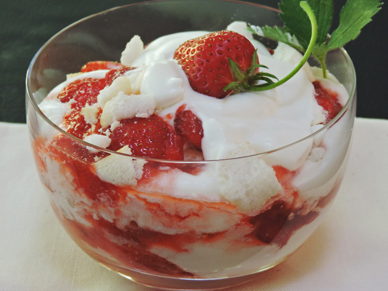 “Eton Mess” is one of those silly names the English have for homey dishes, like Toad in a Hole (sausages cooked in popover batter), Bubble and Squeak (fried mashed potatoes with cabbage), Spotted Dick (boiled pudding with raisins), and Wet Nelly (bread pudding). One story says the name originated at Eton college when a dog sat on a picnic basket that contained a strawberry meringue cake. The resulting mess was so delicious, they’ve been squashing them ever since.