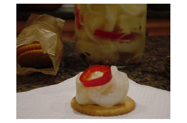 I have an almost identical recipe, except you keep two cups of the 24 hour vinegar as the basis for the final pickling brine. Boil the two cups of saved vinegar with 1-1/2 cups of white sugar, 1 tablespoon of picking spice, one teaspoon of dry pepper flakes and a cup of dry white wine. Let the brine cool before adding the pike. Add about 4 sliced red bell peppers and two sliced vidalia onions in alternating layers with the pike pieces. Pour the cooled brine over the fish and peppers and onions. The fish are ready in about 2 or 3 weeks. Keep the fish refrigerated at all times. Tastes great on Triscuits!!