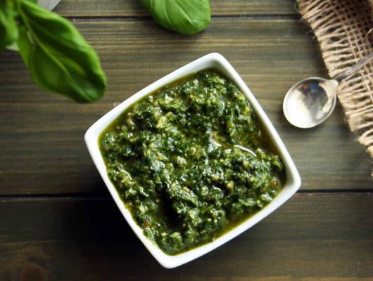 DESCRIPTION: You can still enjoy tasty pesto within the boundaries of your ketogenic diet. This easy keto basil pesto recipe adds nutritional yeast flakes for a cheesy taste without adding dairy.