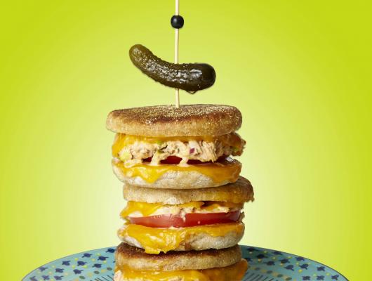 Scoop approximately 3-4 ounces of the tuna salad onto the muffin bottoms followed by 1 slice of tomato and put the tops on.
