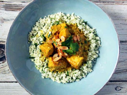 Cook until the mixture has reduced completely, then return the chicken pieces to the pan, along with the coconut cream. Simmer until the coconut cream reduces and thickens. Stir in the stevia and serve the creamy chicken Korma over the warm cauliflower-cardamom rice.