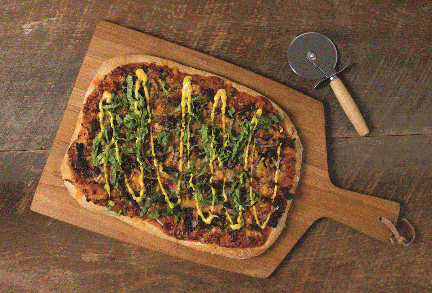 Preheat the oven to 450°F (230°C). Roll the dough out on a lightly floured surface into an 18 x 12-inch rectangle, then transfer to a parchment-lined baking sheet. Stir the tomato sauce with the barbecue sauce and spread over the dough. Sprinkle cheese over the sauce; top with mushrooms mixture, tomatoes and red onion.
