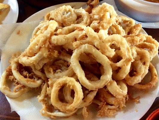 Into a medium sized frying pan pour enough vegetable oil to deep fry the calamari. Heat the oil to medium high heat until it begins to bubble. Fry the calamari in batches for about 2-3 minutes, until nicely golden.