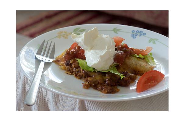 Description: "This easy, spicy Mexican dinner is layered with tomatoes, cheese and corn chips for a guaranteed family favorite!"