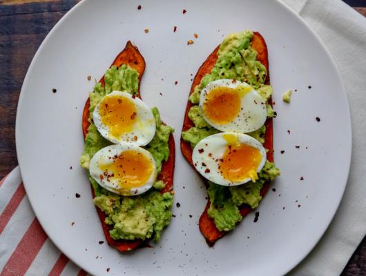 Assemble on a plate using the sweet potato as the toast. Spread avocado mash onto the toast, top with soft-boiled eggs, and garnish with crushed red pepper chili flakes.